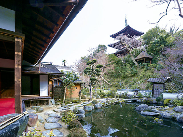 遠州の跡を継ぐ存在が石州です。大和小泉藩初代藩主である片桐貞隆の長男として誕生。千利休の子・道安の門下であった桑山宗仙(貞晴)に茶を学んだとされ、茶道石州流の祖となりました。その石州の偉業を体感できるのが、當麻寺中之坊にある東塔を借景とした桃山期の名庭を石州が改修し現在の姿となった「香藕園」と、初代藩主である父の菩提寺として建立した寺院であり境内全体を一つの茶席として造った「慈光院」。大和三名園(※2)として挙げられる傑作のうち二つが石州の作庭なのです。