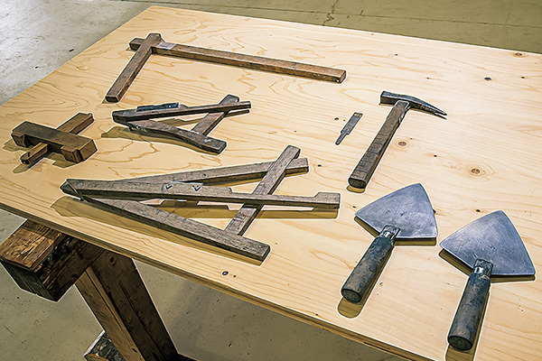 (左から)施工準備に使用する道具(平瓦谷深選別用、軒丸選別用)や、施工時に使用する勾配定規、タガネ、瓦葺金槌、スルメゴテ。