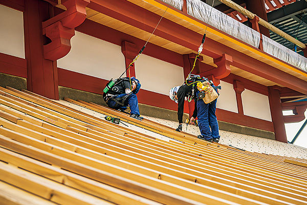 山本:普段は修復がほとんどで、今回の平城宮跡第一次大極殿院東楼復原のような新築の現場は非常に稀です。新築では鉄骨との併用など新しい要素に対応する緊張感があります。修復では文化財として既存部材を極力残し、小さな傷みも削って継ぎ足すなど、根気のいる作業が続きます。