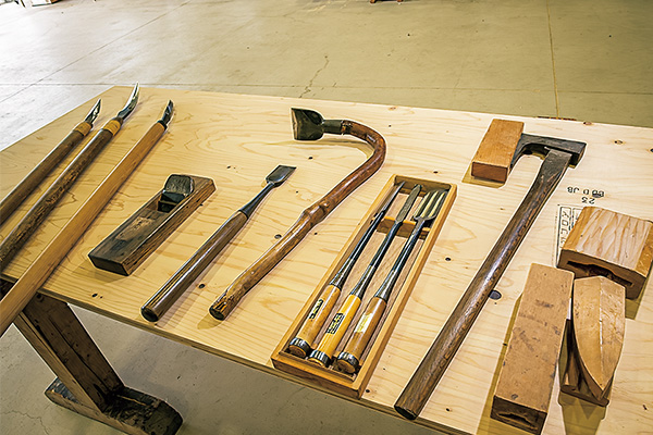 (左端から)飛鳥時代より使われていたとされる「槍鉋」をはじめ、大鉋、大突鑿(おおつきのみ)、釿(ちょうな)、穴屋鑿(あなやのみ)、ヨキなどの伝統的な宮大工道具の数々。